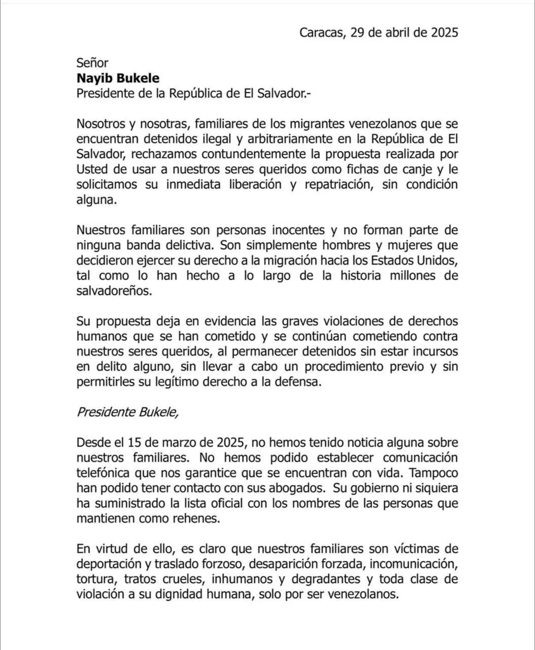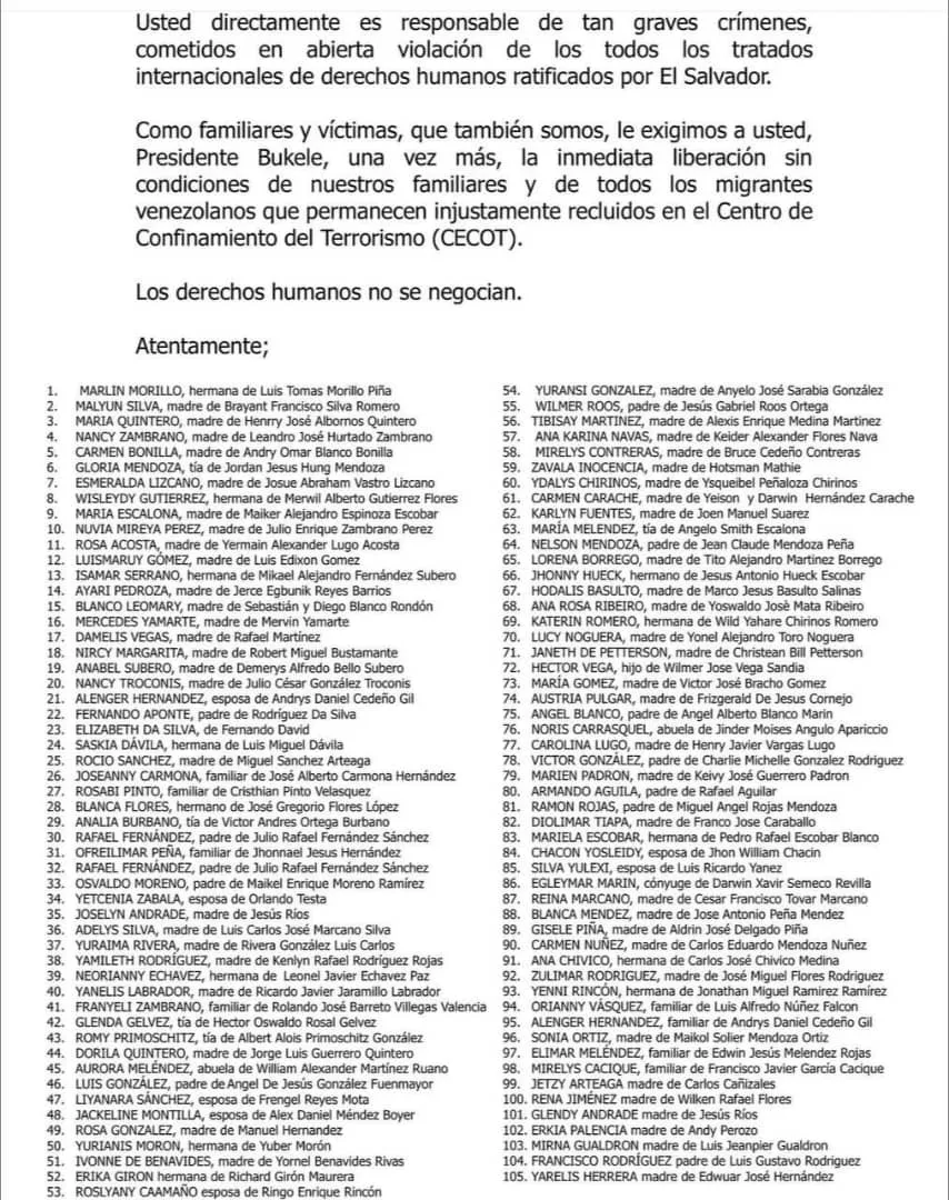 En la misiva, los familiares subrayan que los migrantes venezolanos no tienen vínculos con organizaciones delictivas y que su detención sin proceso legal vulnera derechos fundamentales. Desde el 15 de marzo de 2025, han permanecido sin información sobre sus seres queridos, sin posibilidad de comunicación telefónica ni contacto con abogados.