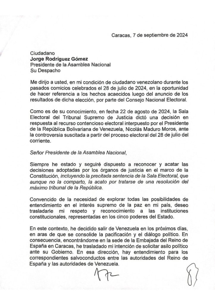Uno de los acontecimientos políticos mas significativos en Venezuela, el presidente de la AN (Asamblea Nacional), Jorge Rodríguez, presentó una carta firmada por el líder opositor Edmundo González Urrutia, en la que este último acata la sentencia del Tribunal Supremo de Justicia (TSJ) que valida la reelección de Nicolás Maduro como presidente.